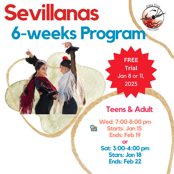 Join our Sevillanas class and experience the beauty of this folk Spanish dance! Sevillanas offers a taste of flamenco dance and is especially popular during the Seville fair. In this class, we focus on hand, arm, and body movements, as well as footwork and spatial awareness in the dance room. Discover the joy of Sevillanas and immerse yourself in its beautiful expressions!